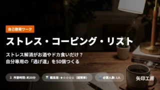 ワークショップ 【無料PDF付】ストレス・コーピング・リスト|ストレス発散がお酒やドカ食いだけ?自分専用の「逃げ道」を50個つくるメンタル回復術 「イライラしてついドカ食いしてしまう」「ストレス発散がお酒しかなくて落ち込む」そんなあなたへ。プロも使う『ストレス・コーピング』という心理学ワークで、お金も時間もかからない『自分専用の小さな逃げ道』を50個書き出す方法をご紹介します。無料のPDFワークシート付き。 2026.03.12 ワークショップ自己啓発