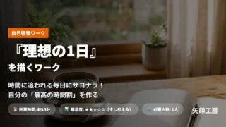 ワークショップ 【無料PDF付】『理想の1日』を描くワーク|時間に追われる毎日にサヨナラ!自分の「最高の時間割」を作る 時間やお金に制限がなかったら、どんな1日を過ごしたいですか?「『理想の1日』を描くワーク」のシートを使って、自分が本当に望んでいるライフスタイルを視覚化し、明日から変えられる小さな行動を見つける自己分析ワークです。(無料ワークシート付) 2026.03.08 ワークショップ自己啓発