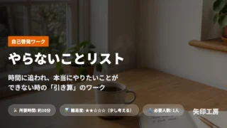 ワークショップ 【無料PDF付】やらないことリスト(Not-To-Do List)|時間がない毎日にサヨナラ!本当に大切なことに集中する「引き算」のワーク 「やりたいことはあるのに、いつも時間がなくてできない……」そんな悩みを抱えていませんか?実は、新しいことを始める前に必要なのは「やらないこと」を決めること。心と時間の余白を作る「やらないことリスト」の作り方をご紹介します。 2026.03.09 ワークショップ自己啓発